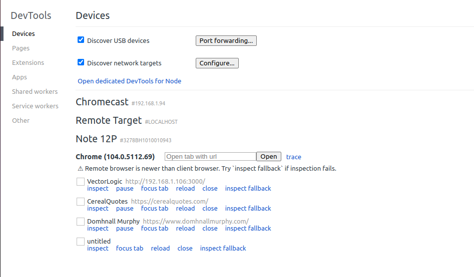 enabled for debuggng. In your case you should hopefully see your mobile device listed, with an entry of each Chrome tab open in your