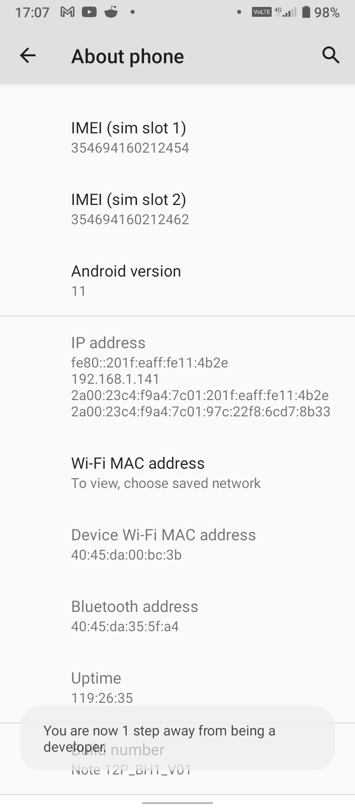 Enabling developer-mode on an Android device (Ulefone Note 12P).